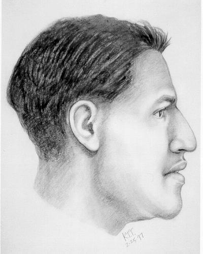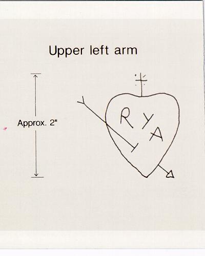 The deceased is a young adult Hispanic male, approximately 5'0” tall, 105 lbs. and of slight build, with brown eyes, black hair and a faint black moustache. The decedent had a small cross tattoo (approximately 5/8” in height) on his lower left forearm. Another tattoo is found on his upper left arm. This consists of a heart (approximately 2” in height) with the initials “R Y A” written inside with an arrow through the heart horizontally and a small cross on top of the heart. The decedent was found near CR 22 and FM 289 in Frisco on 12/15/1988. Cause of death is multiple stab wounds.